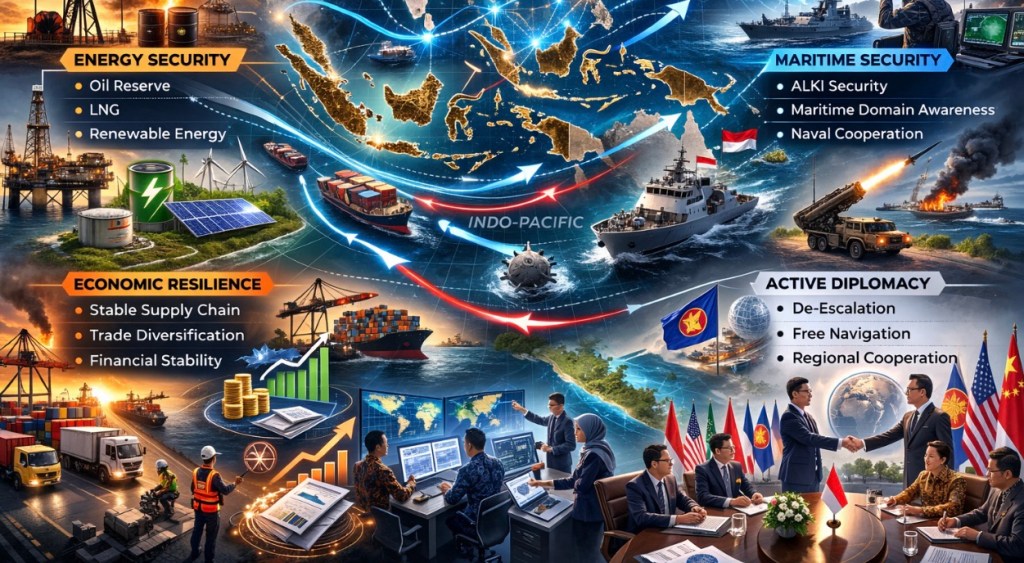 Di domain maritim, Selat Hormuz kembali menjadi pusat gravitasi geopolitik karena posisinya sebagai choke point utama ekspor minyak dan gas dari Teluk menuju pasar dunia. Data lembaga energi menunjukkan volume minyak mentah dan produk minyak yang transit Selat Hormuz merupakan porsi yang sangat besar dari perdagangan minyak global, sehingga bahkan gangguan kecil dapat memicu lonjakan risk premium dan volatilitas harga (International Energy Agency [IEA], 2023; U.S. Energy Information Administration [EIA], 2023). Karena itulah pasar bereaksi cepat: analis dan pelaku pasar menilai premi risiko geopolitik meningkat seiring kekhawatiran gangguan suplai melalui Hormuz, dan pergerakan harga Brent mencerminkan masuknya kembali risk premium ketika tensi AS–Iran meningkat (Reuters, 2026). Sejumlah analisis pasar bahkan memproyeksikan skenario harga yang lebih tinggi jika terjadi disrupsi fisik terhadap suplai, meskipun tetap ada ruang de-eskalasi apabila tidak terjadi gangguan nyata pada arus ekspor (Reuters, 2026).