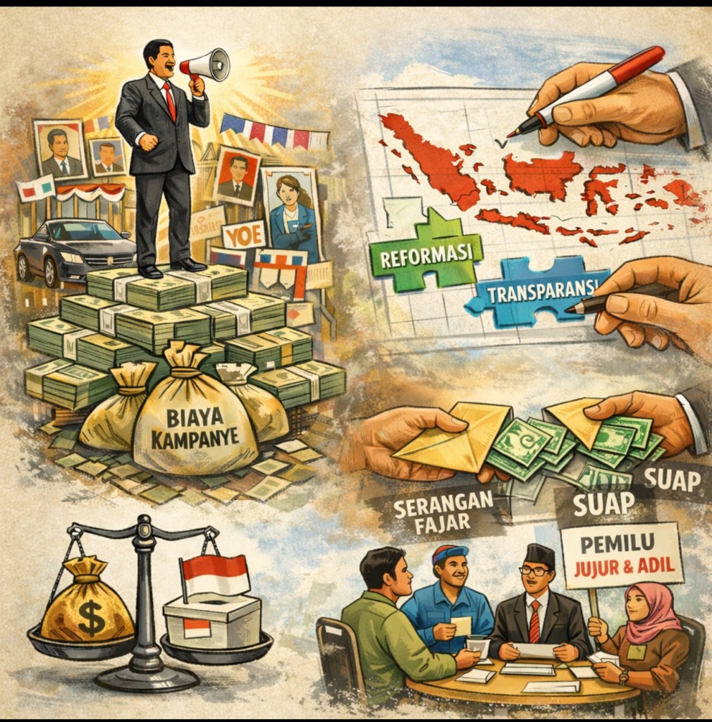 Reformasi membongkar kontrol otoriter atas arena politik, tetapi tidak secara simultan membangun partai yang terinstitusionalisasi, sistem pembiayaan politik yang sehat, mekanisme rekrutmen kandidat yang transparan, serta pengawasan pembiayaan politik yang mampu menembus praktik informal. Dalam konteks seperti itu, biaya masuk ke jabatan publik menjadi tinggi, pembiayaan privat menjadi dominan, dan transaksi politik menjadi strategi yang rasional bagi aktor yang ingin menang dalam kompetisi elektoral (Mietzner, 2015; Slater, 2004).